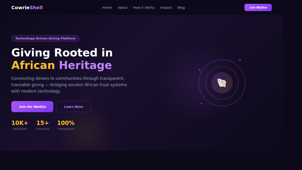 A technology-driven giving platform inspired by African heritage, connecting donors to communities through transparent and traceable giving. Features waitlist registration, donor and organisation portals, and impact tracking.