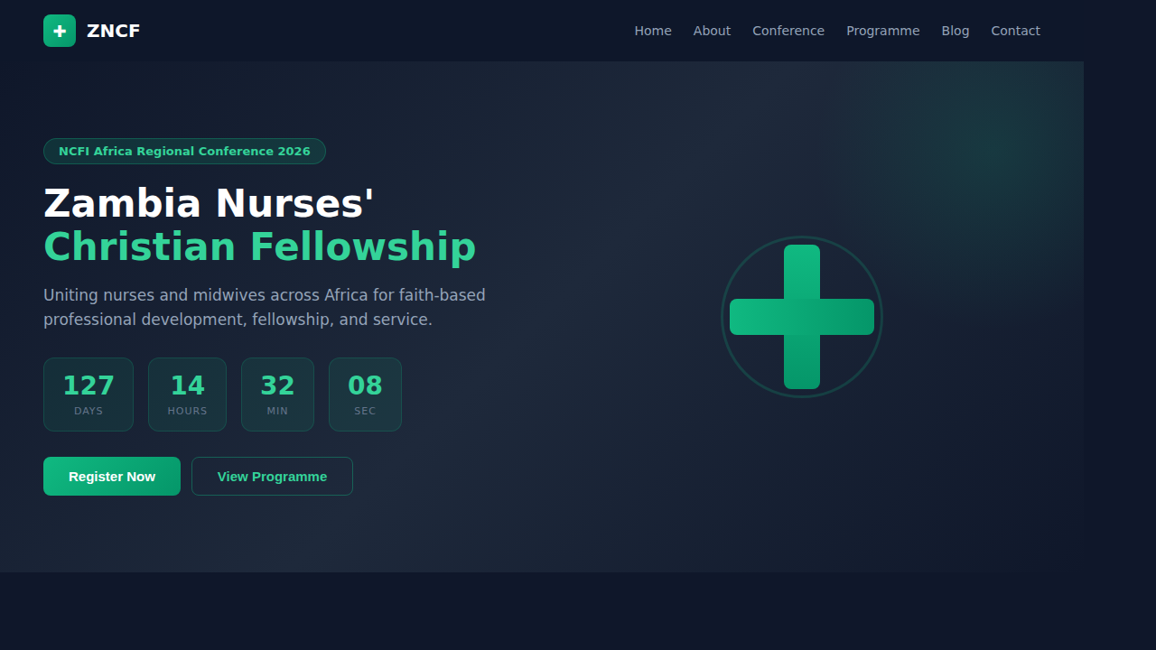 A comprehensive conference and chapter website for the Zambia Nurses' Christian Fellowship, featuring event registration, programme scheduling, accommodation gallery, blog system, and countdown timer — built for the NCFI Africa Regional Conference 2026.